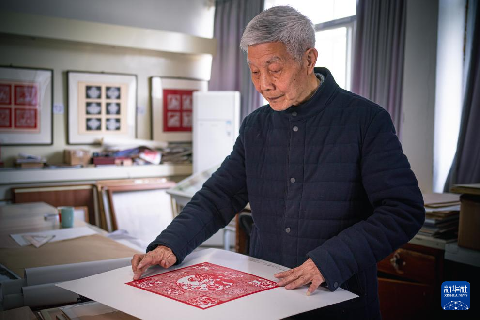 卢发良在工作室内展示自己的细纹刻纸作品“中国年”(3月12日摄)。