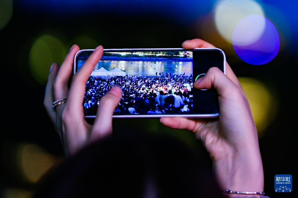 4月23日,在兰州市城关区的黄河兰州段近水平台,游客用手机拍摄“兰州黄河大合唱”活动。