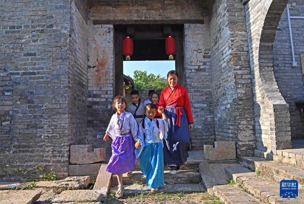 一名老师带着几名孩子在广西来宾市象州县罗秀镇纳禄村的古学堂里体验(10月10日摄)。