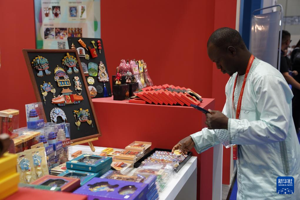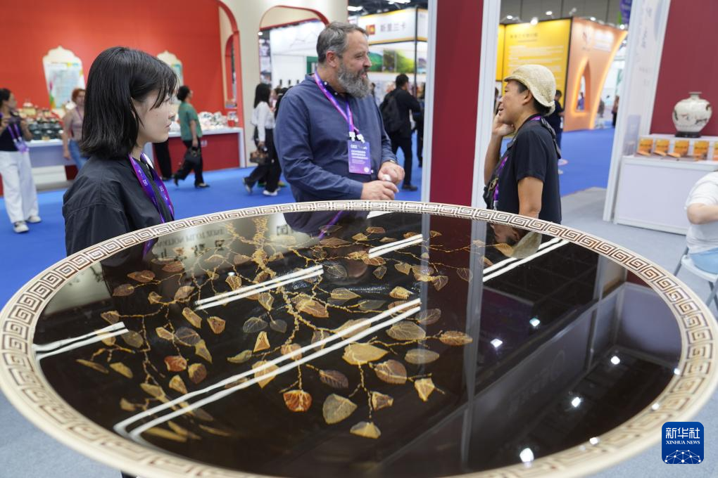 10月18日,参展商在陶瓷博览会展区观看文创产品。
