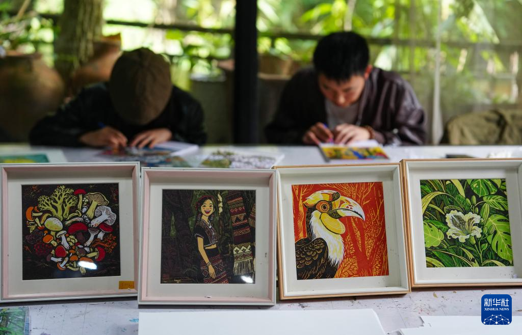 10月22日,在云南普洱学院那柯里绝版木刻教学实践基地,普洱学院艺术学院学生在上色。