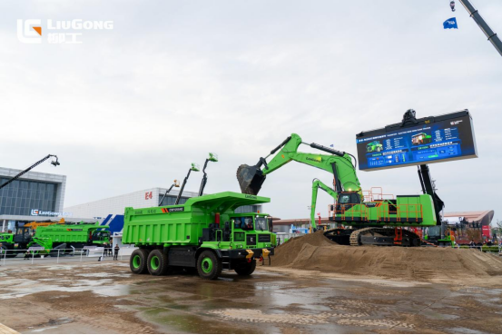 柳工9135FE电动挖掘机、DW120AE纯电动矿用车联合演示作业