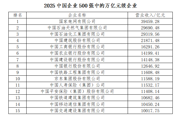 “2025中國企業(yè)500強(qiáng)”榜單發(fā)布 15家企業(yè)超過萬億規(guī)模