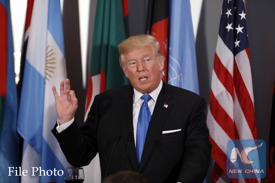 U.S. President Donald Trump speaks during a Heads of States Luncheon hosted by the United Nations Secretary-General Antonio Guterres, at the UN headquarters in New York, Sept. 19, 2017. (Xinhua/Li Muzi)
