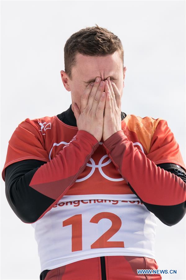 Nevin Galmarini of Switzerland celebrates after winning men's parallel giant slalom of snowboard at the 2018 PyeongChang Winter Olympic Games at Phoenix Snow Park, PyeongChang, South Korea, Feb. 24, 2018. Nevin Galmarini won the gold medal in the big final. (Xinhua/Wu Zhuang)