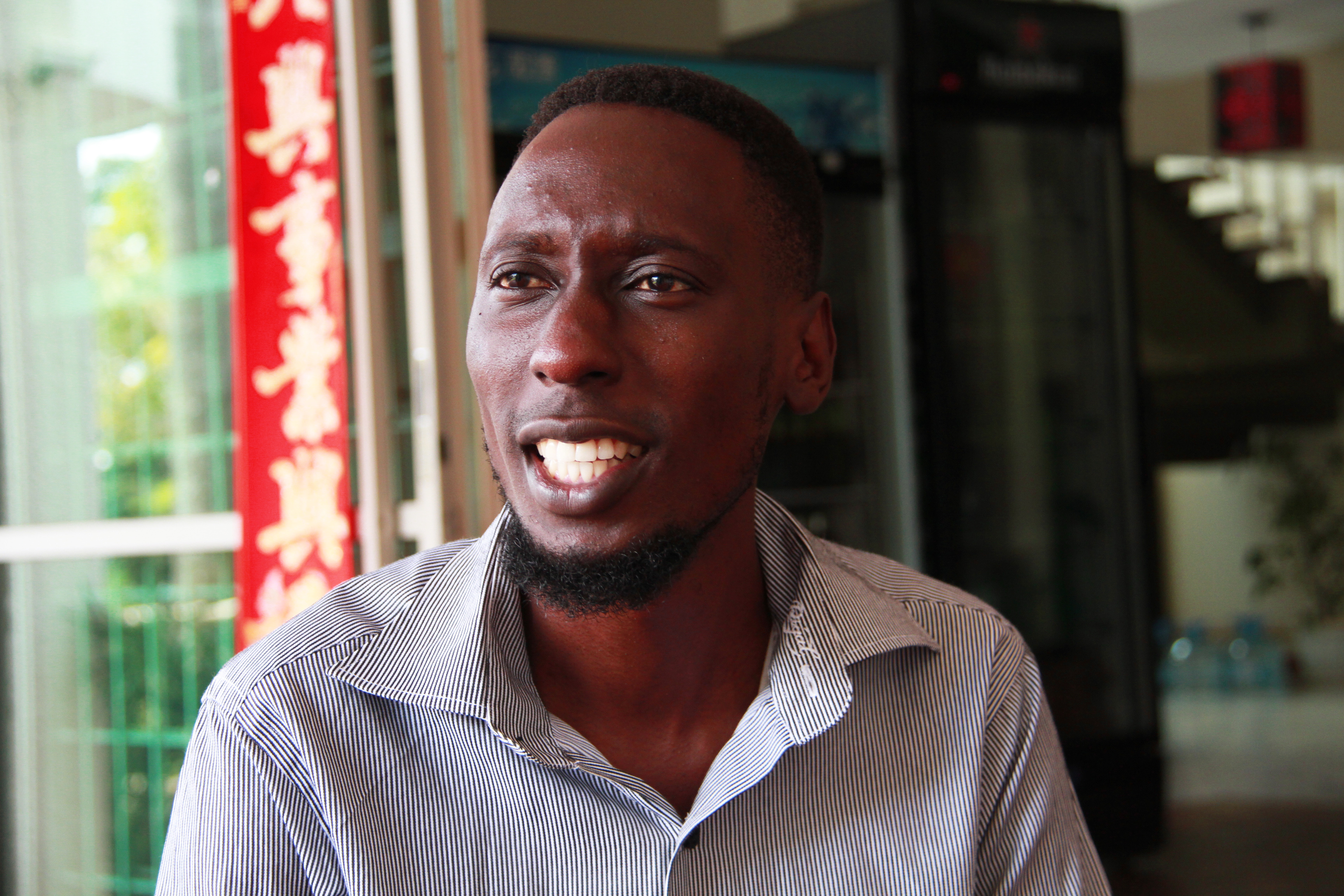 Sadat Magezi, a 26-year-old businessman, receives an interview with Xinhua News Agency in Kampala, Uganda, Sept. 11, 2018. (Xinhua/Zhang Gaiping)