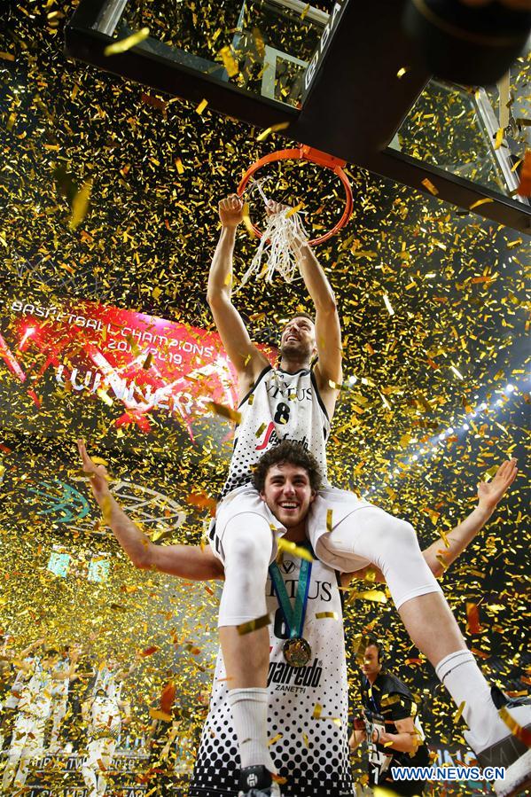 Segafredo Virtus Bologna's Filippo Baldi Rossi (Top) and Alessandro Pajola cut the net to celebrate their victory after winning the final match between Segafredo Virtus Bologna and Iberostar Tenerife of the FIBA Basketball Champions League in Antwerp, Belgium, May 5, 2019. The Segafredo Virtus Bologna won 73-61 and claimed the title. (Xinhua/Zheng Huansong)