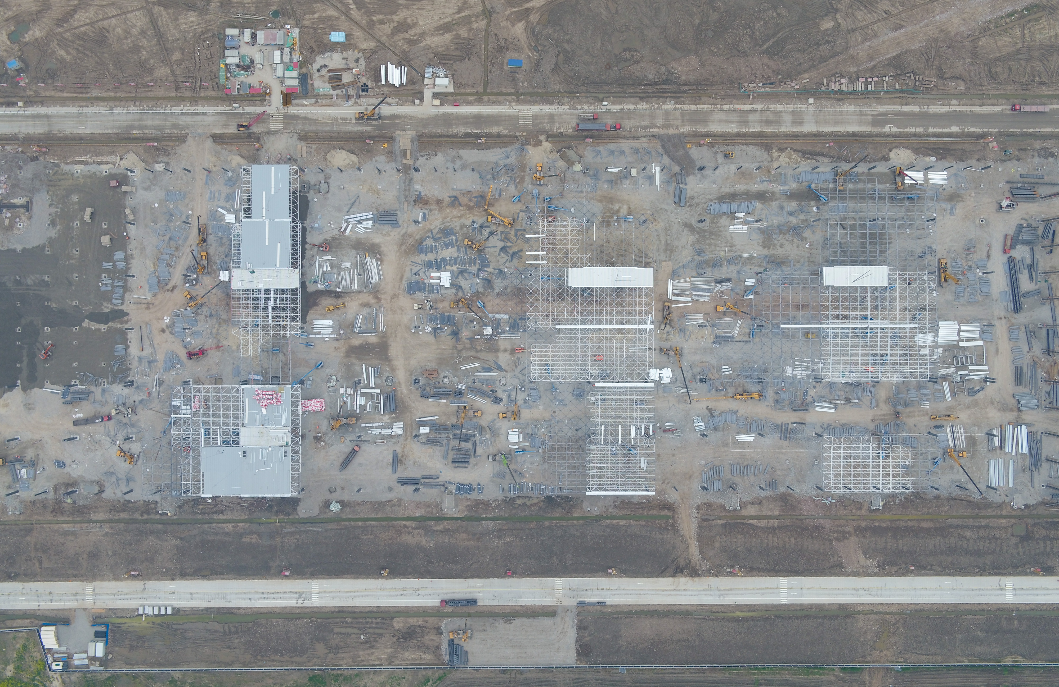 Aerial photo taken on April 3, 2019 shows the construction site of Tesla's new gigafactory in the Lingang Area of Shanghai, east China. In October 2018, the company got an approval to use an 864,885-square-meter tract of land in Lingang for its Shanghai plant, which has an annual production capacity of 500,000 electric cars. (Xinhua/Ding Ting)