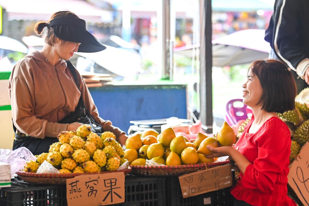 A customer purchases imported fruits at a market near the Dongxing port in Dongxing, south China's Guangxi Zhuang Autonomous Region, April 17, 2025. (Xinhua/Cao Yiming)