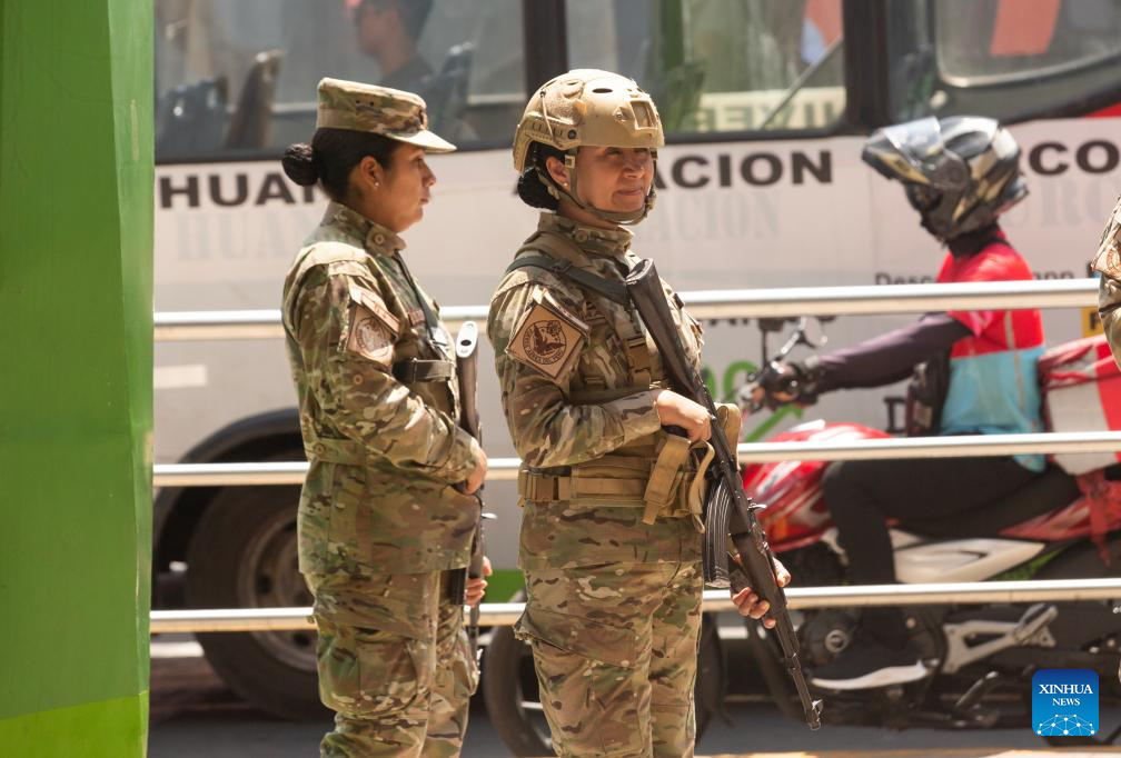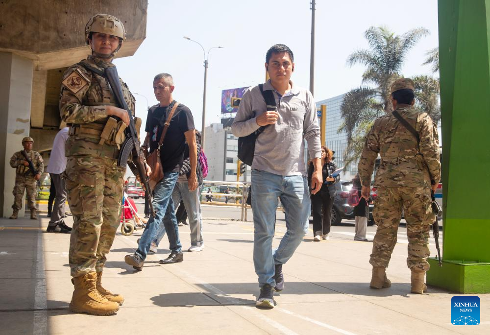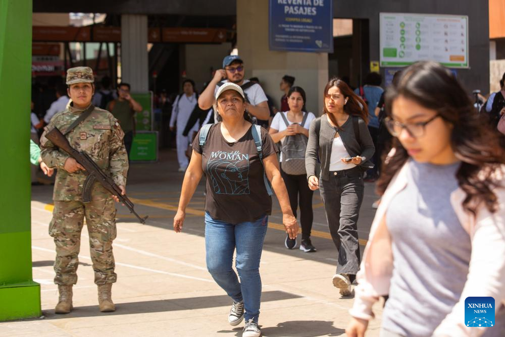 Service women patrol the La Cultura metro station in Lima, Peru, on Oct. 22, 2025. Peruvian President Jose Jeri declared on Tuesday a 30-day state of emergency for the capital Lima and the neighboring Callao region to tackle worsening public security. (Xinhua/Mariana Bazo)