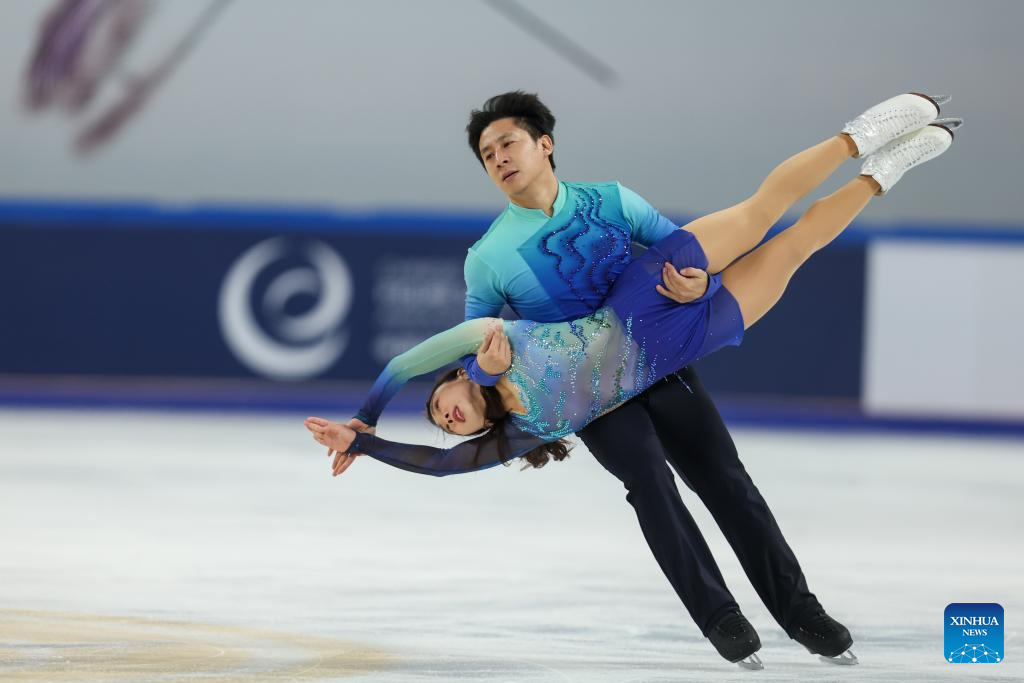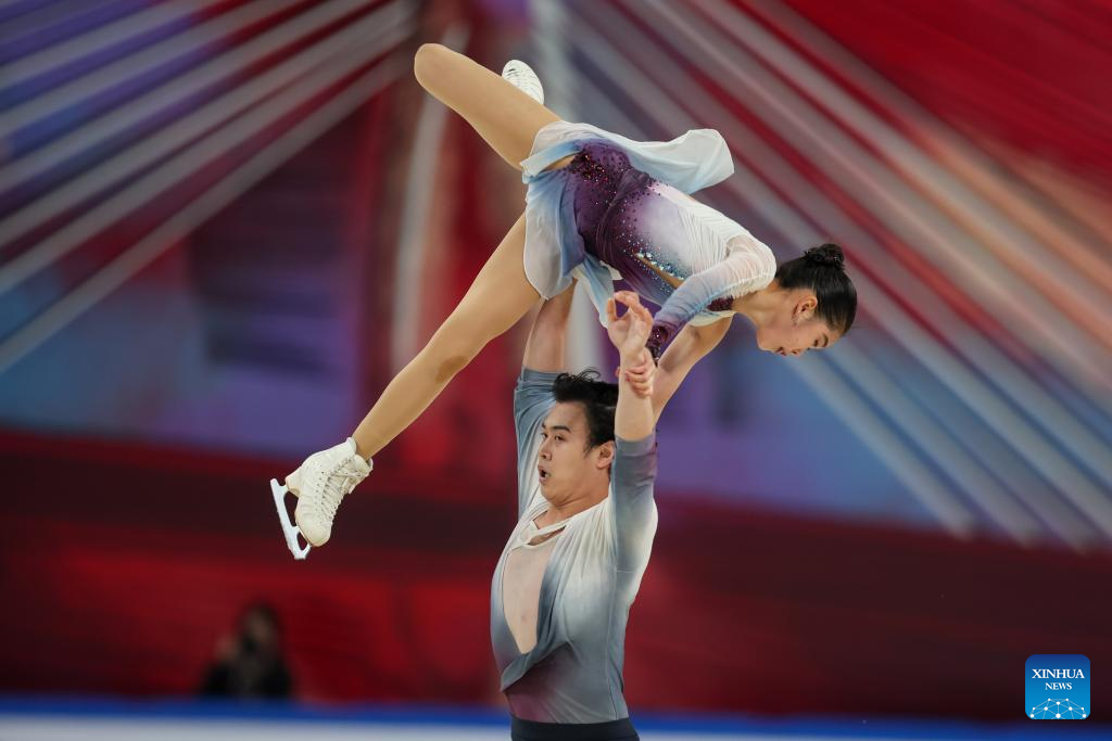 Zhang Jiaxuan (R)/Huang Yihang of China perform during the pair skating free skating at the Cup of China ISU Grand Prix of Figure Skating 2025 in southwest China's Chongqing Municipality, on Oct. 25, 2025. (Xinhua/Huang Wei)