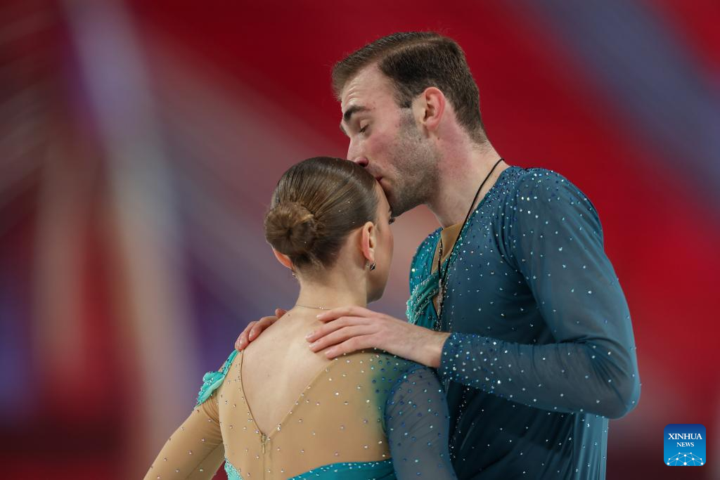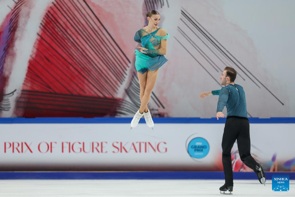 Anastasiia Metelkina (L)/Luka Berulava of Georgia perform during the pair skating free skating at the Cup of China ISU Grand Prix of Figure Skating 2025 in southwest China's Chongqing Municipality, on Oct. 25, 2025. (Xinhua/Huang Wei)