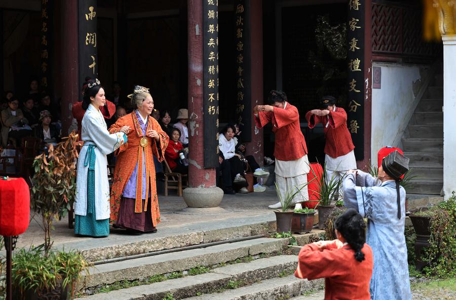 Tourists watch a performance themed on filial responsibility in Dachen Village of Quzhou, east China's Zhejiang Province, Oct. 25, 2025. (Xinhua/Jin Haoyuan)■