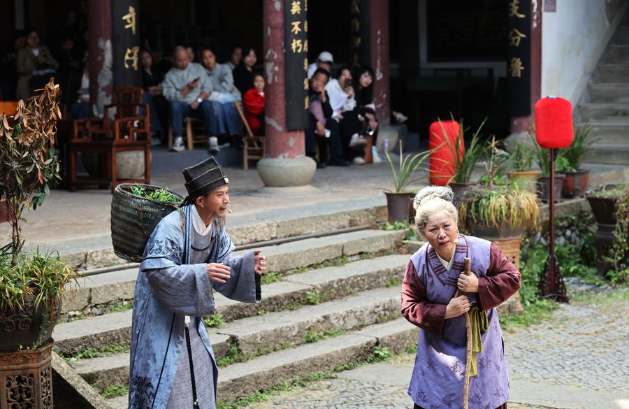 Performers are seen during a performance themed on filial responsibility in Dachen Village of Quzhou, east China's Zhejiang Province, Oct. 25, 2025. (Xinhua/Jin Haoyuan)