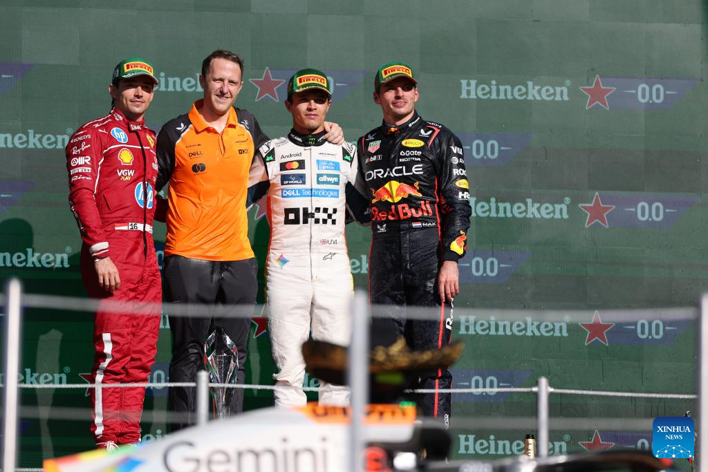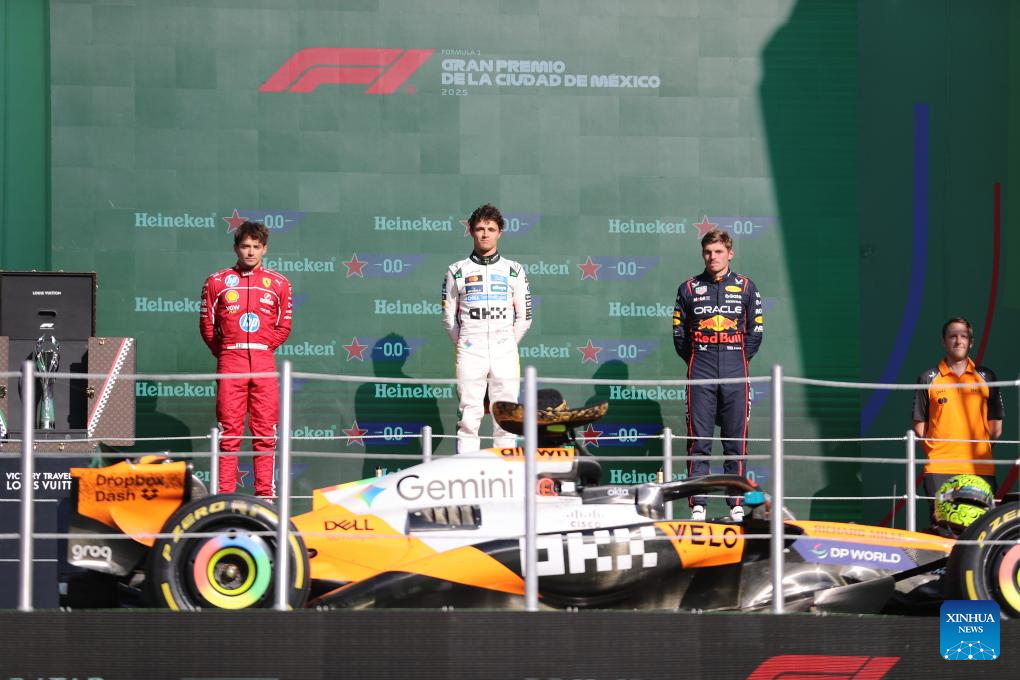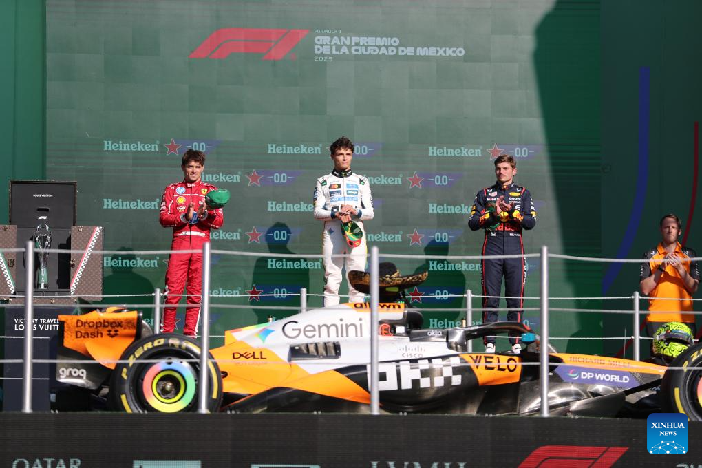 First-placed McLaren's British driver Lando Norris (C), second-placed Ferrari's Monegasque driver Charles Leclerc (L) and third-placed Red Bull's Dutch driver Max Verstappen attend the awarding ceremony for the Formula One Mexico Grand Prix at the Hermanos Rodriguez Circuit in Mexico City, Mexico, Oct. 26, 2025. (Xinhua/Li Mengxin)