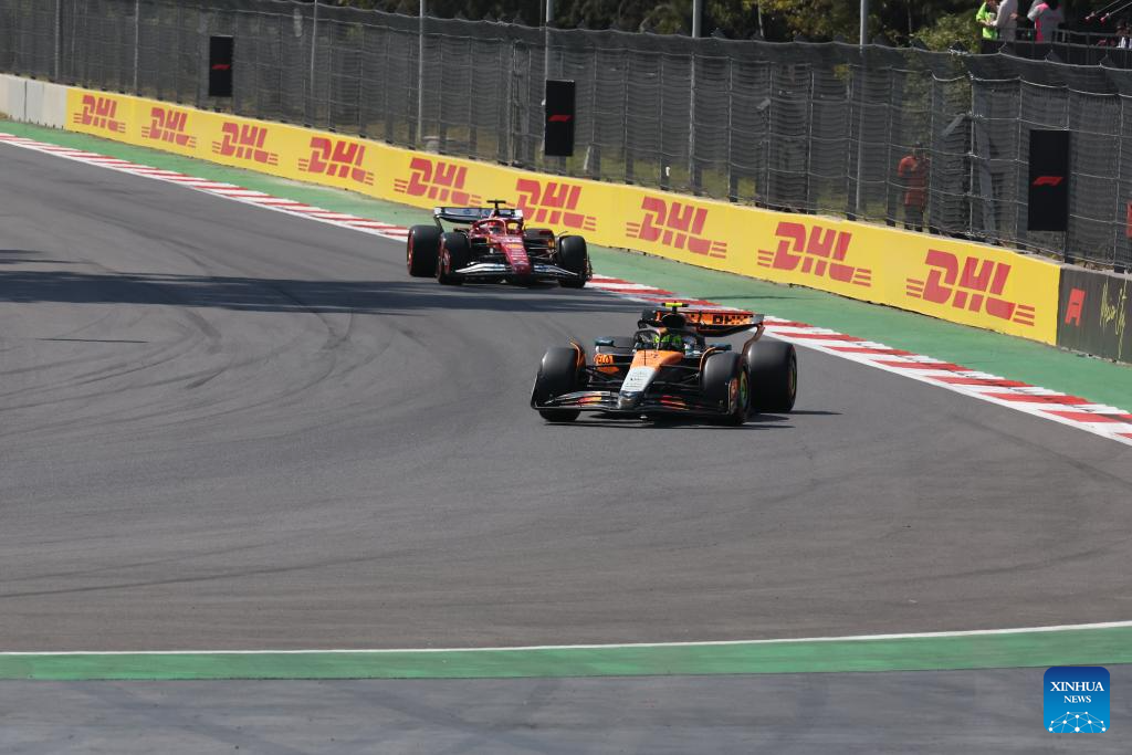 McLaren's British driver Lando Norris (front) competes during the Formula One Mexico Grand Prix at the Hermanos Rodriguez Circuit in Mexico City, Mexico, Oct. 26, 2025. (Xinhua/Li Mengxin)