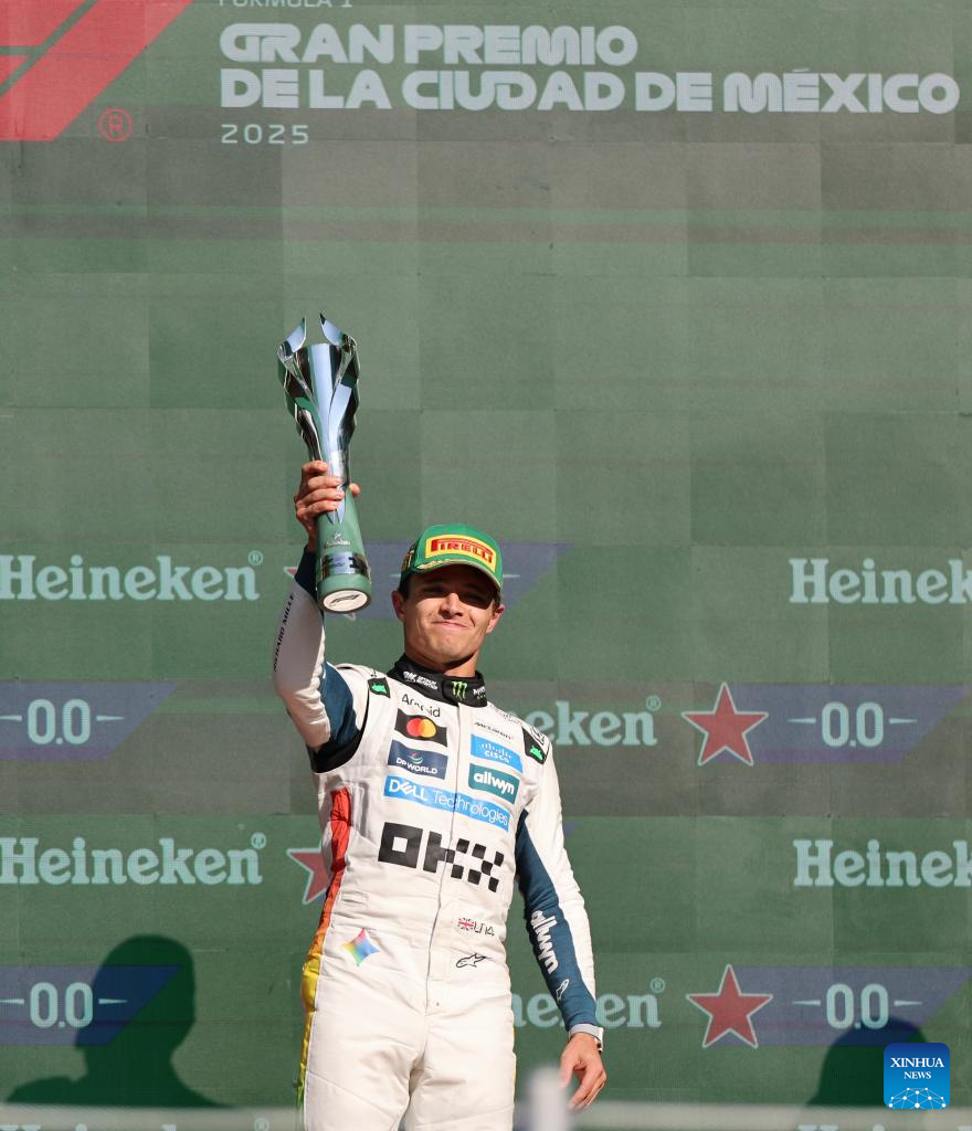First-placed McLaren's British driver Lando Norris attends the awarding ceremony for the Formula One Mexico Grand Prix at the Hermanos Rodriguez Circuit in Mexico City, Mexico, Oct. 26, 2025. (Xinhua/Li Mengxin)