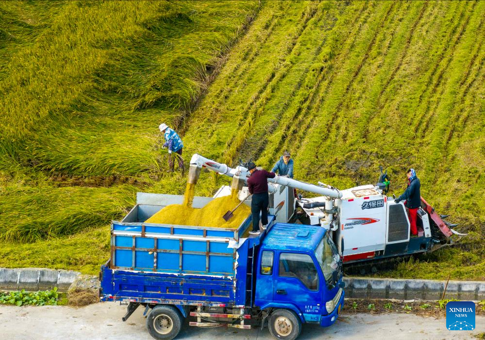 A drone photo taken on Oct. 22, 2025 shows farmers harvesting paddy in Xuzhuang Village of Suchen Town in Hailing District in Taizhou City, east China's Jiangsu Province. (Photo by Tang Dehong/Xinhua)