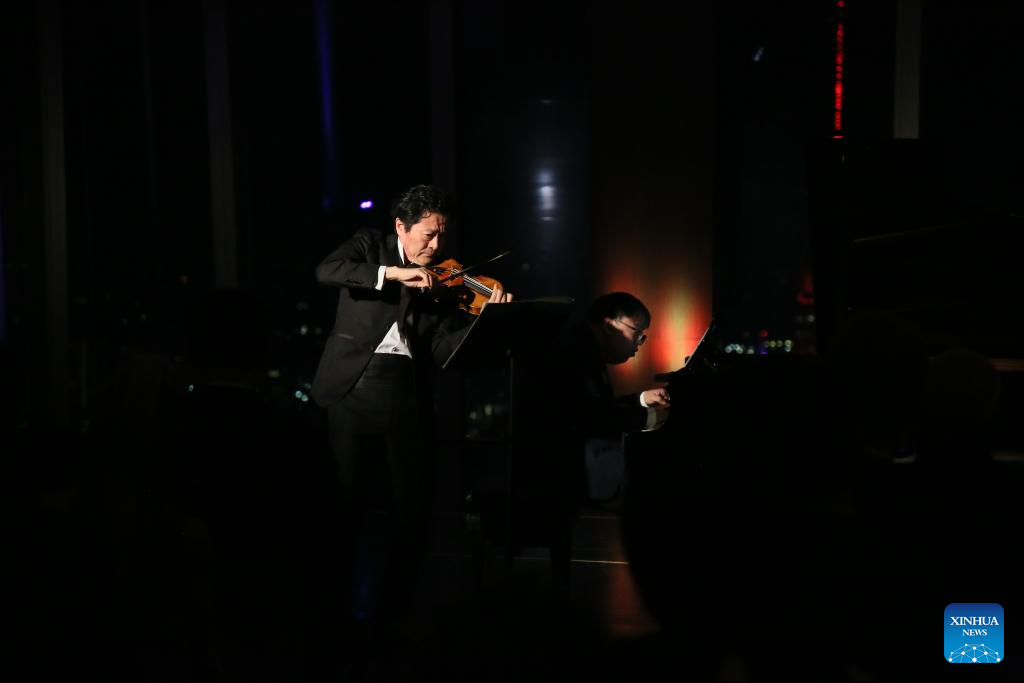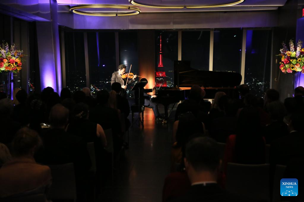 Violinist Lyu Siqing and pianist Wei Zijian perform during a concert named Moonlit Melodies to celebrate the Mid-Autumn Festival at the Peak Event Space of the Edge in New York city, the United States, on Oct. 6, 2025. The Mid-Autumn Festival in China, which is celebrated annually on the 15th day of the eighth month in the Chinese lunar calendar, falls on Oct. 6 this year. (Xinhua/Zhang Fengguo)