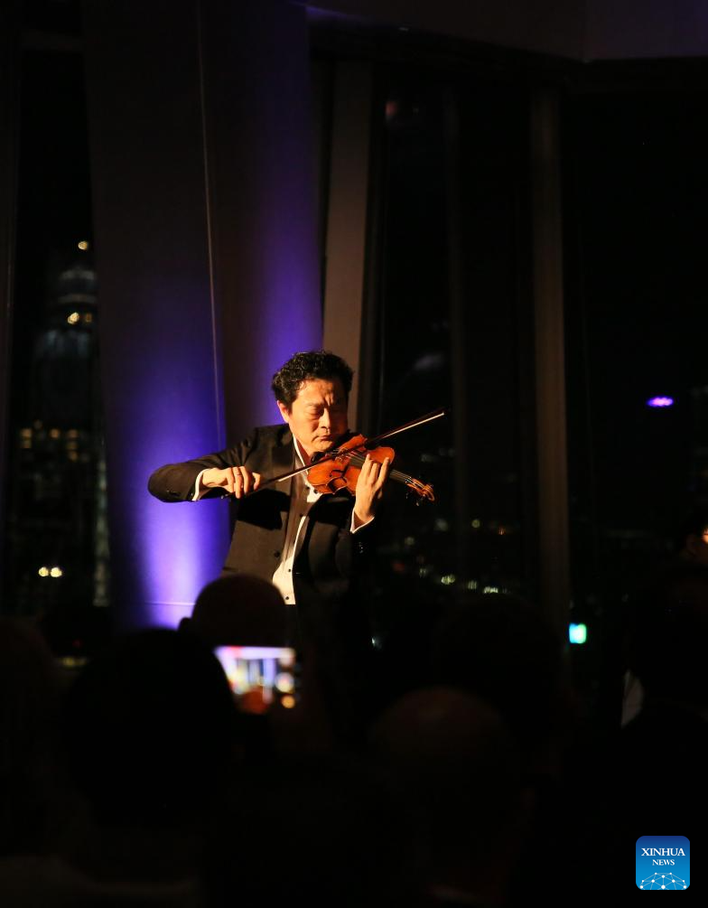 Violinist Lyu Siqing performs during a concert named Moonlit Melodies to celebrate the Mid-Autumn Festival at the Peak Event Space of the Edge in New York city, the United States, on Oct. 6, 2025. The Mid-Autumn Festival in China, which is celebrated annually on the 15th day of the eighth month in the Chinese lunar calendar, falls on Oct. 6 this year. (Xinhua/Zhang Fengguo)