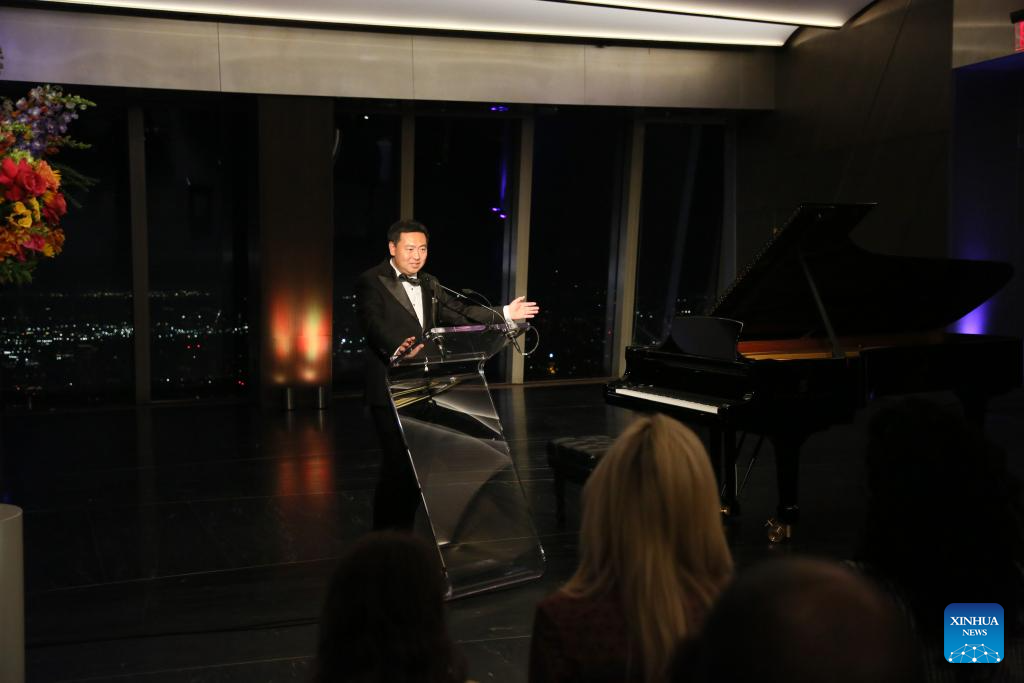 China's Consul General in New York Chen Li speaks before a concert named Moonlit Melodies to celebrate the Mid-Autumn Festival at the Peak Event Space of the Edge in New York city, the United States, on Oct. 6, 2025. The Mid-Autumn Festival in China, which is celebrated annually on the 15th day of the eighth month in the Chinese lunar calendar, falls on Oct. 6 this year. (Xinhua/Zhang Fengguo)