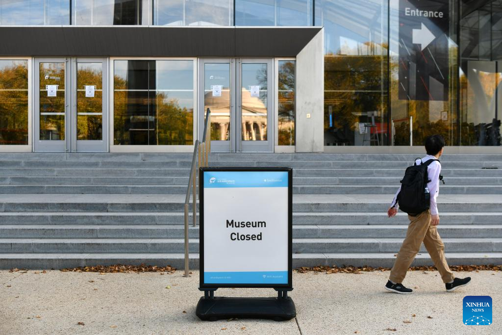 A notice of closure is seen at the entrance of the National Air and Space Museum in Washington, D.C., the United States, Oct. 21, 2025.