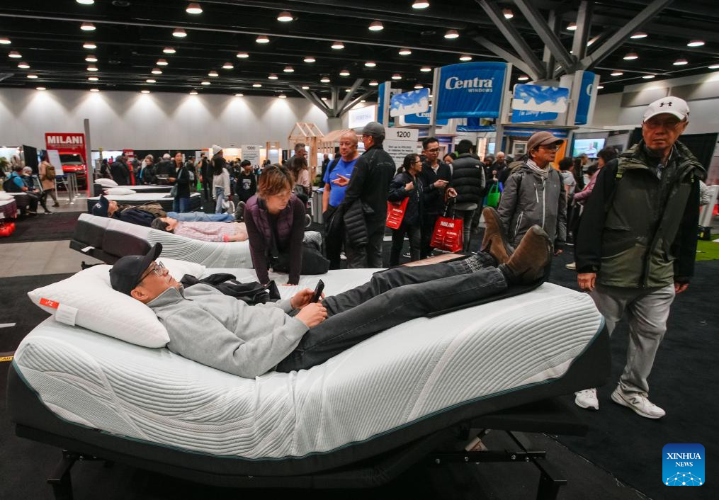 A man tries out a sofa during the 2025 Vancouver Fall Home Show at the Vancouver Convention Centre in Vancouver, Canada, Oct. 23, 2025. The 2025 Vancouver Fall Home Show kicked off here on Thursday and will last until Sunday, showcasing home-related products and services. (Photo by Liang Sen/Xinhua)