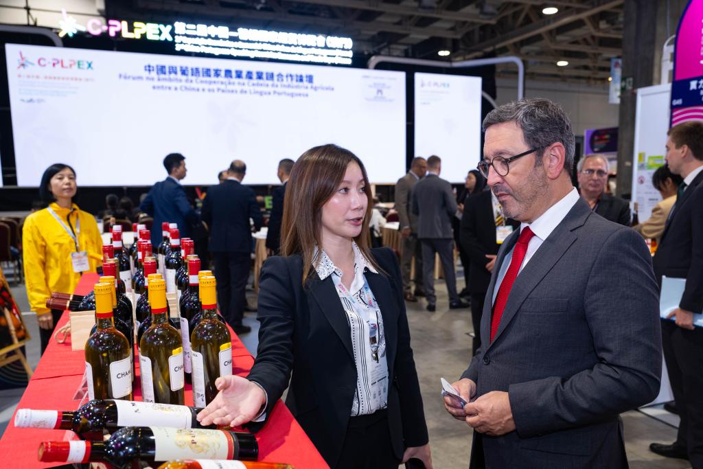 10月22日,工作人员在第二届中国—葡语国家经贸博览会(澳门)展台介绍葡萄酒。新华社发(张金加 摄)