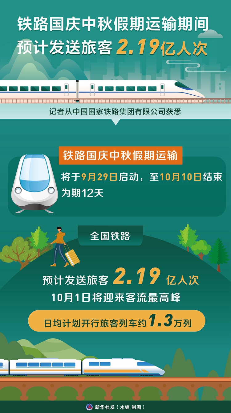 新华社北京9月28日电(记者樊曦)记者从中国国家铁路集团有限公司获悉,铁路国庆中秋假期运输将于9月29日启动,至10月10日结束,为期12天,全国铁路预计发送旅客2.19亿人次,10月1日将迎来客流最高峰,日均计划开行旅客列车约1.3万列。