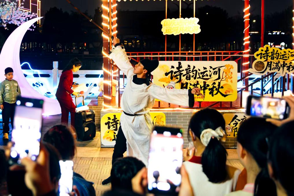 在济宁市任城区“运河记忆”历史文化街区,演职人员正在表演。(受访者供图)