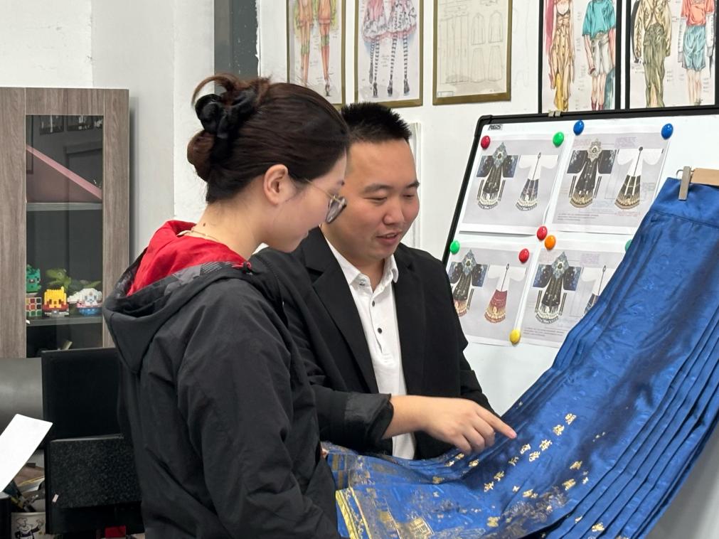 陈龙告诉记者,除了制作联名款汉服,他还通过校外实习等方式,吸引了不少服装设计专业的高校学生来到他的工作室实习。在这里,学生不仅要锻炼设计技能,还要深入接触汉服生产的每一个环节,学会与生产企业、设计团队沟通,让自己的设计落地,并做好未来的职业规划。