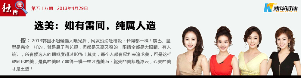 【選美?公然作弊?】 整容技術(shù)越來越先進(jìn),偽造美麗卻到了該反思的地步。韓國(guó)小姐的比賽分為真、善、美三個(gè)競(jìng)賽部分。現(xiàn)在看來,比賽已經(jīng)無法體現(xiàn)“真”這個(gè)部分了。