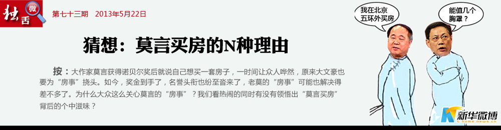 猜想二:安得廣廈五環(huán)外 安居才能樂業(yè),即便莫言用諾貝爾獎金買房,也是可以理解的。一直以來,文人的命運(yùn),往往與時代命運(yùn)息息相關(guān)。居高不下的房價,卻是百姓之痛。