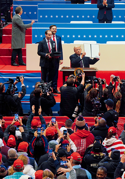 美国总统特朗普 1月 20日签署行政令,宣布美国将再次退出旨在应对气候变化的《巴黎协定》。图为当天,在美国首都华盛顿第一资本体育馆,特朗普签署行政令