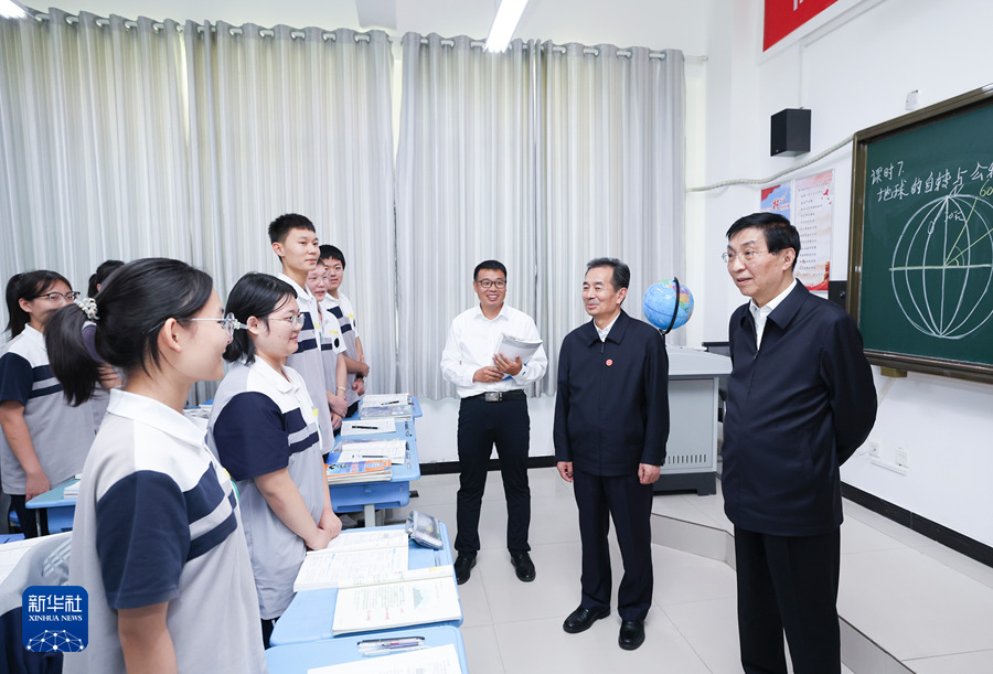 9月25日下午,受习近平总书记嘱托,中共中央政治局常委、全国政协主席、中央代表团团长王沪宁带领中央代表团部分成员在巴音郭楞蒙古自治州库尔勒市看望慰问当地各族干部群众。这是王沪宁和中央代表团部分成员在库尔勒市第二十三中学考察教育援疆情况。