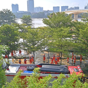 10月12日,消防救援人员在郁江广西南宁城区河段岸边清淤。