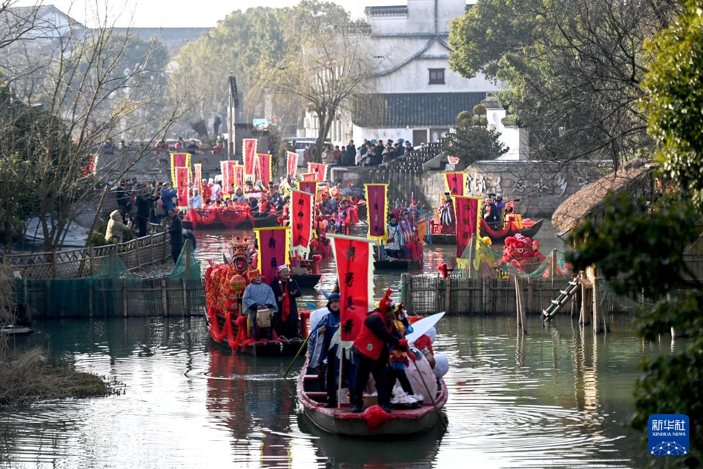 2023年1月26日,在浙江省湖州市南浔区和孚镇荻港村,渔船在水上古道巡游。