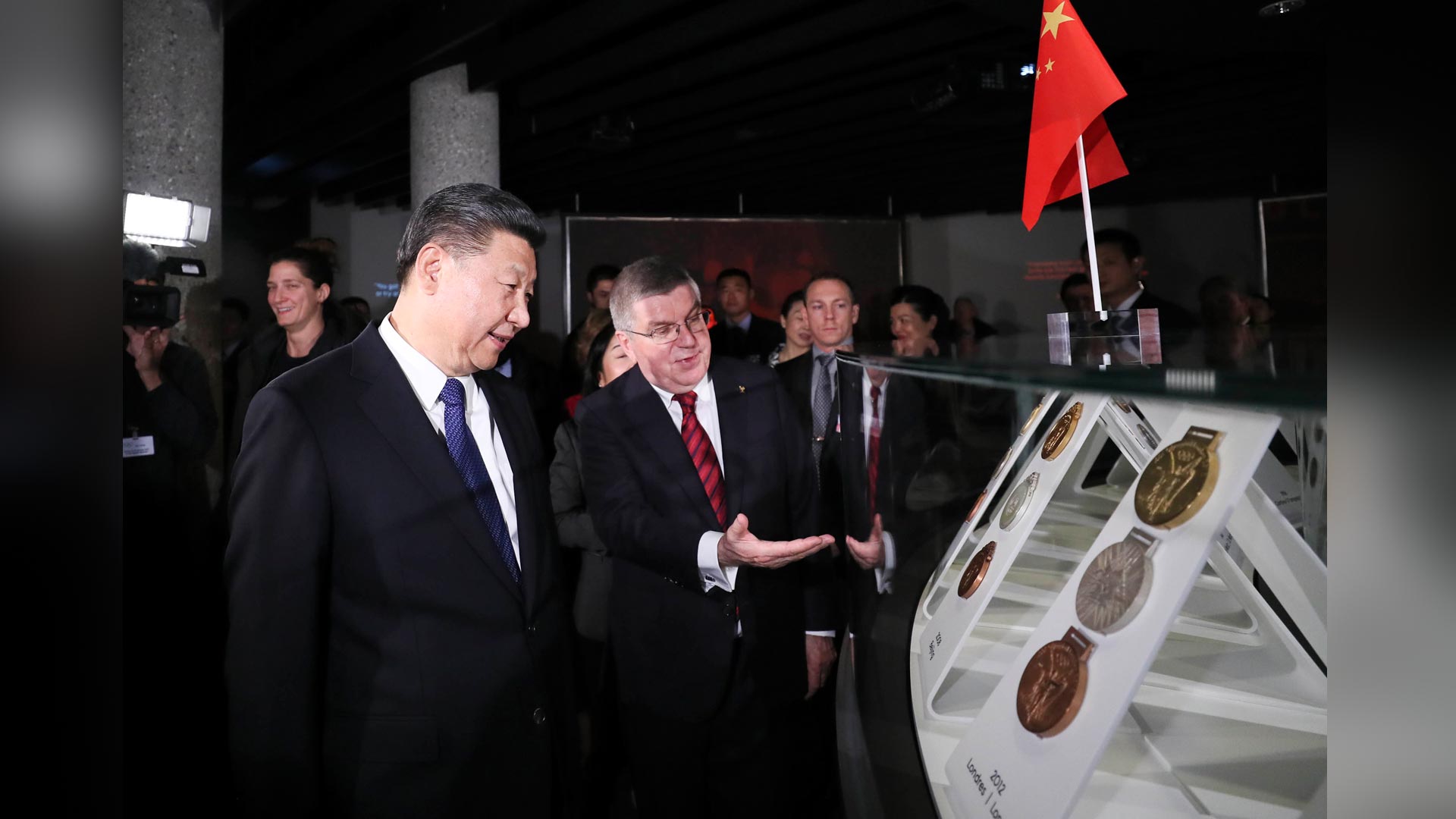 1月18日,國(guó)家主席習(xí)近平在瑞士洛桑國(guó)際奧林匹克博物館會(huì)見(jiàn)國(guó)際奧林匹克委員會(huì)主席巴赫。這是會(huì)見(jiàn)后,習(xí)近平在巴赫陪同下參觀往屆奧運(yùn)會(huì)獎(jiǎng)牌展。新華社記者 蘭紅光 攝2017-01-19