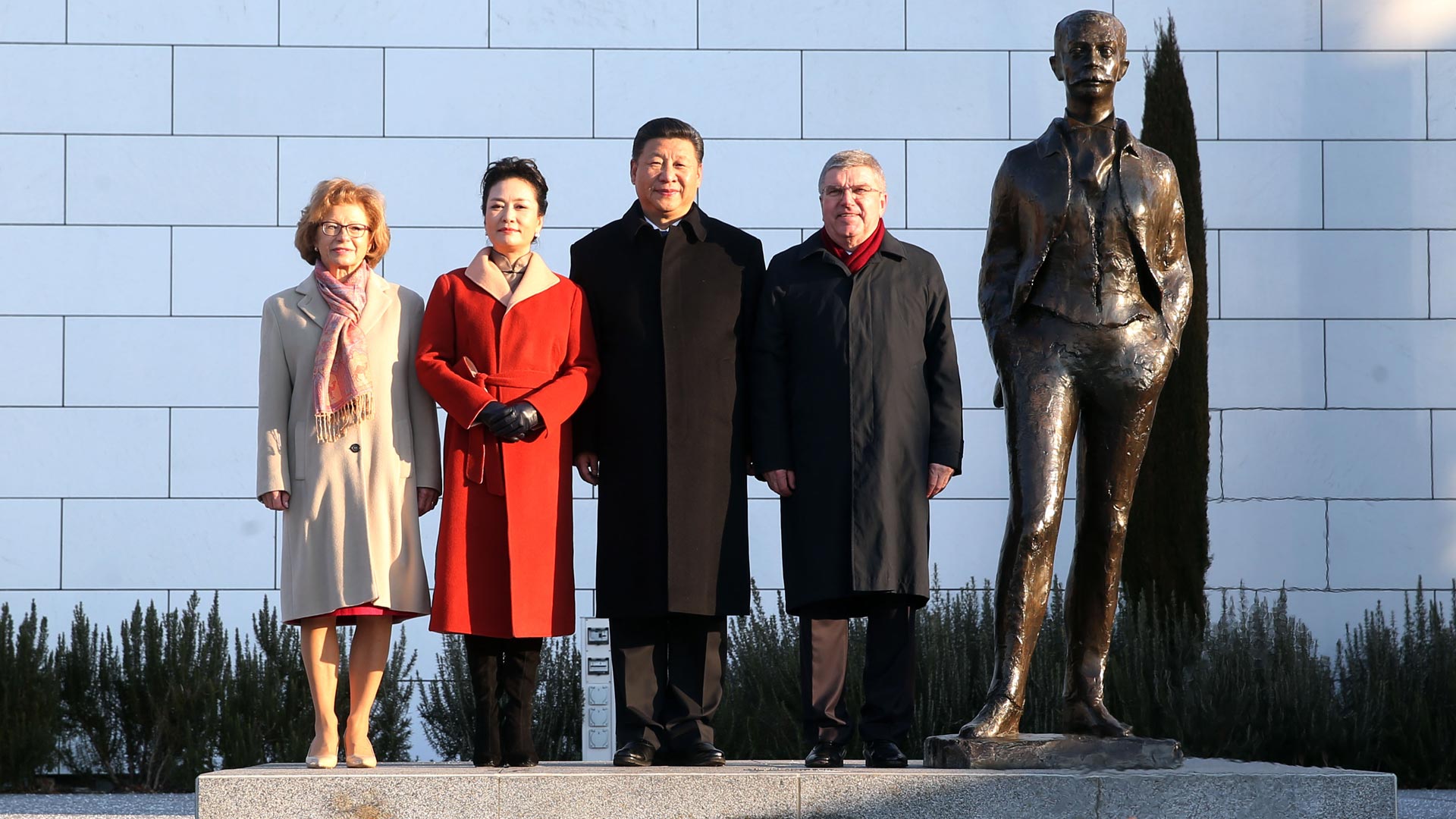 1月18日,國(guó)家主席習(xí)近平在瑞士洛桑國(guó)際奧林匹克博物館會(huì)見(jiàn)國(guó)際奧林匹克委員會(huì)主席巴赫。這是習(xí)近平和夫人彭麗媛與巴赫夫婦在現(xiàn)代奧林匹克運(yùn)動(dòng)發(fā)起人顧拜旦雕像前合影。新華社記者 姚大偉 攝2017-01-19