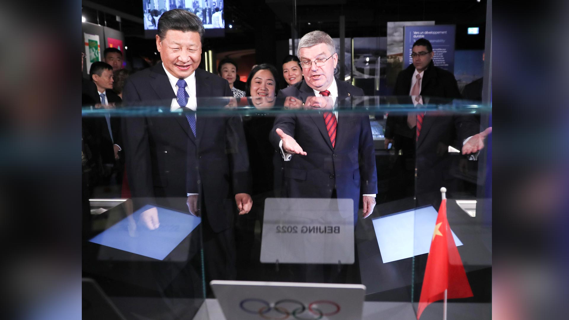 1月18日,國(guó)家主席習(xí)近平在瑞士洛桑國(guó)際奧林匹克博物館會(huì)見(jiàn)國(guó)際奧林匹克委員會(huì)主席巴赫。這是會(huì)見(jiàn)后,習(xí)近平在巴赫陪同下參觀國(guó)際奧林匹克博物館。新華社記者 姚大偉 攝2017-01-19