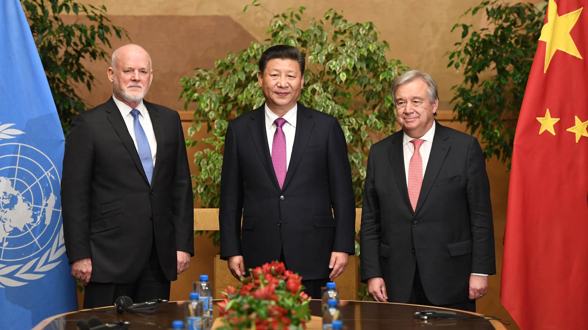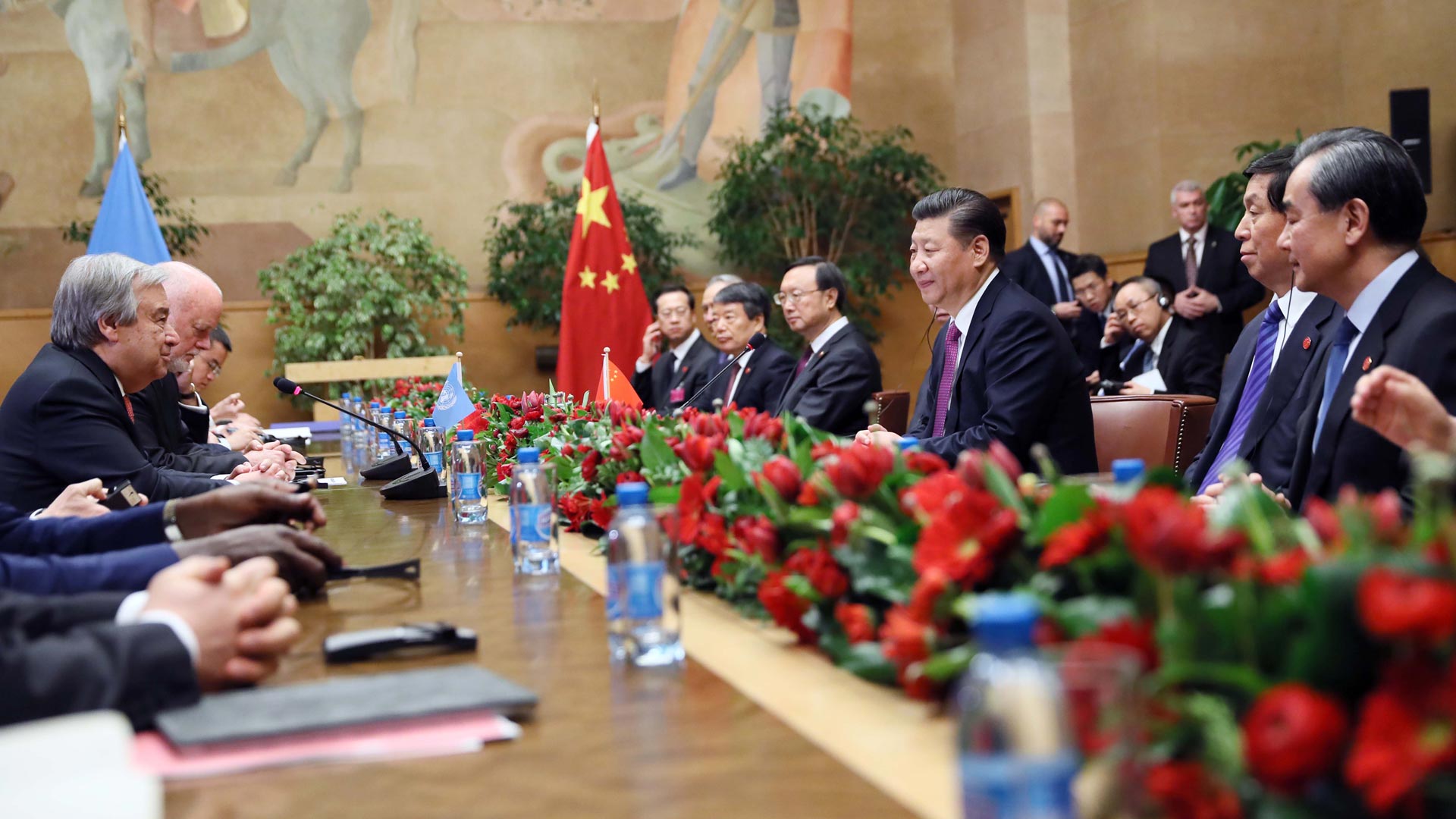 1月18日,國(guó)家主席習(xí)近平在瑞士日內(nèi)瓦萬(wàn)國(guó)宮會(huì)見(jiàn)第71屆聯(lián)合國(guó)大會(huì)主席湯姆森和聯(lián)合國(guó)秘書長(zhǎng)古特雷斯。 新華社記者 張鐸 攝2017-01-19
