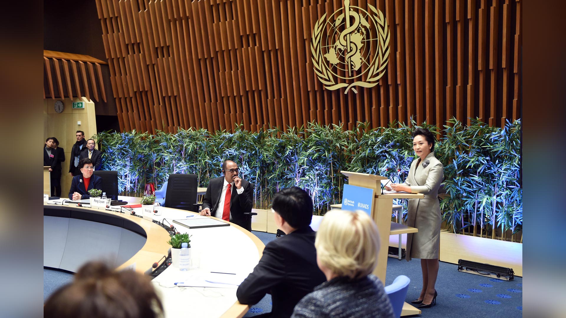 1月18日,國(guó)家主席習(xí)近平夫人、世界衛(wèi)生組織結(jié)核病和艾滋病防治親善大使彭麗媛應(yīng)世界衛(wèi)生組織總干事陳馮富珍和聯(lián)合國(guó)艾滋病規(guī)劃署執(zhí)行主任西迪貝邀請(qǐng),在瑞士日內(nèi)瓦出席為她舉行的親善大使任期續(xù)延暨頒獎(jiǎng)儀式。這是世界衛(wèi)生組織總干事陳馮富珍向彭麗媛頒發(fā)世衛(wèi)組織榮譽(yù)勛章。新華社記者謝環(huán)馳攝2017-01-19