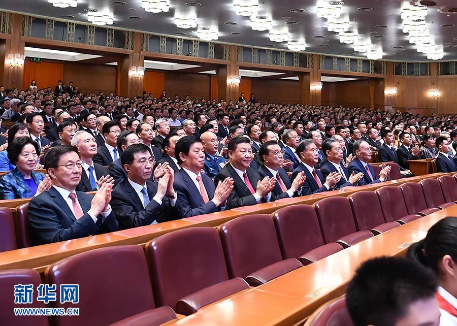 人民大會(huì)堂萬人大禮堂處處歡聲笑語。二樓眺臺(tái)的橫幅格外醒目:緊密團(tuán)結(jié)在以習(xí)近平同志為核心的黨中央周圍,不忘初心、牢記使命,奮力奪取新時(shí)代中國(guó)特色社會(huì)主義偉大勝利!大會(huì)堂天幕上,投映著姹紫嫣紅的鮮花圖案,營(yíng)造出熱烈喜慶的氣氛。兩面紅旗造型的舞臺(tái)墻矗立在臺(tái)口,36名儀仗兵分列兩側(cè)。