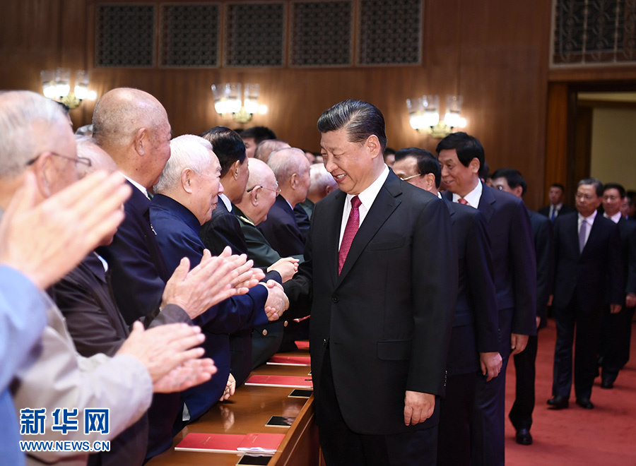 19時(shí)55分,在歡快的樂曲聲中,習(xí)近平等領(lǐng)導(dǎo)同志步入大禮堂,同老同志代表親切握手,向他們致以崇高敬意,全場(chǎng)響起熱烈掌聲。