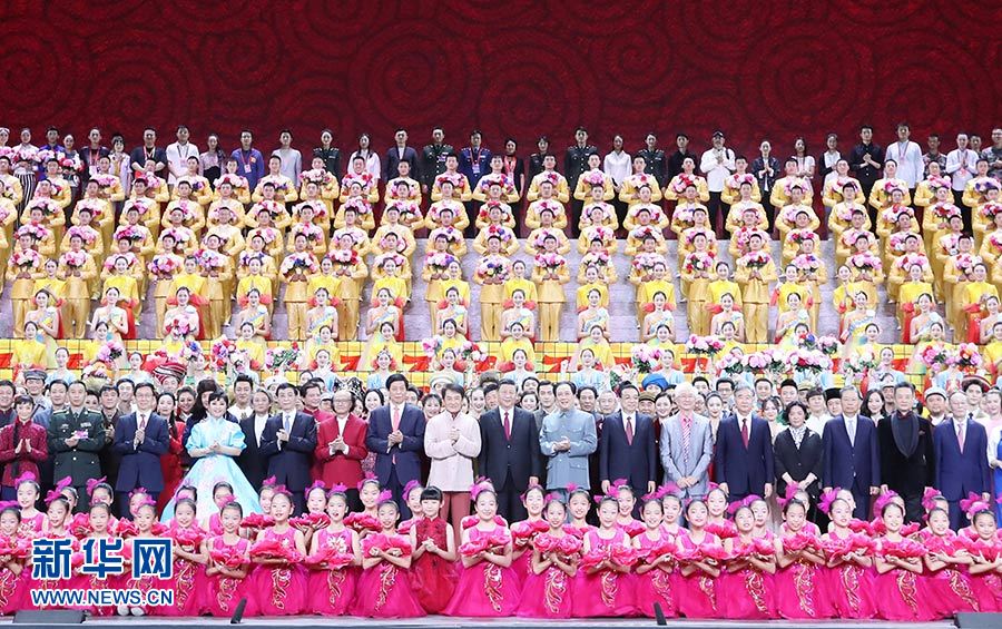 9月29日,慶祝中華人民共和國(guó)成立70周年大型文藝晚會(huì)《奮斗吧 中華兒女》在北京人民大會(huì)堂舉行。習(xí)近平、李克強(qiáng)、栗戰(zhàn)書、汪洋、王滬寧、趙樂際、韓正、王岐山等黨和國(guó)家領(lǐng)導(dǎo)人同4000多名觀眾一起觀看演出。演出結(jié)束后,習(xí)近平等走上舞臺(tái)同演職人員合影留念。 新華社記者 王曄 攝
