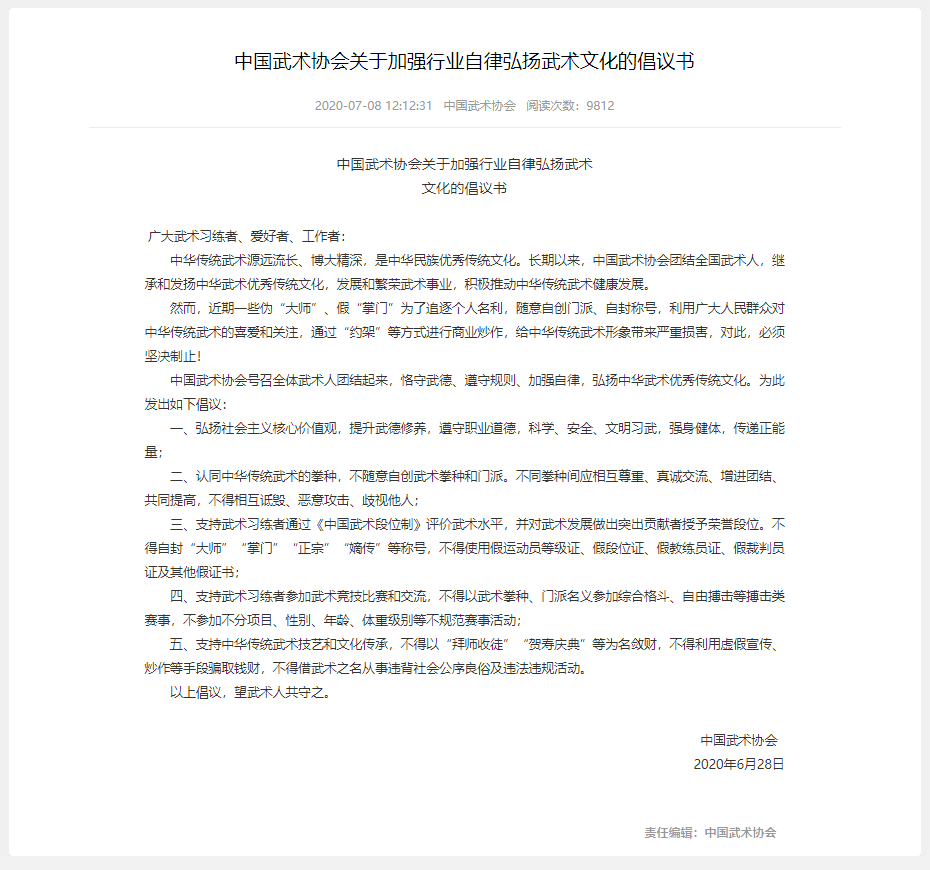中國武術(shù)協(xié)會在其網(wǎng)站發(fā)布《關(guān)于加強行業(yè)自律弘揚武術(shù)文化的倡議書》,號召全體武術(shù)人團結(jié)起來,恪守武德、遵守規(guī)則、加強自律,弘揚中華武術(shù)優(yōu)秀傳統(tǒng)文化,并倡議武術(shù)習練者不得自封“大師”“掌門”“正宗”“嫡傳”等稱號,不得以武術(shù)拳種、門派名義參加綜合格斗、自由搏擊等搏擊類賽事,不參加不分項目、性別、年齡、體重級別等不規(guī)范賽事活動。