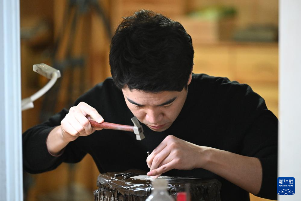 马赛在工作室内錾刻(3月7日摄)。
