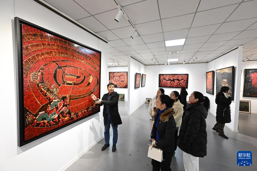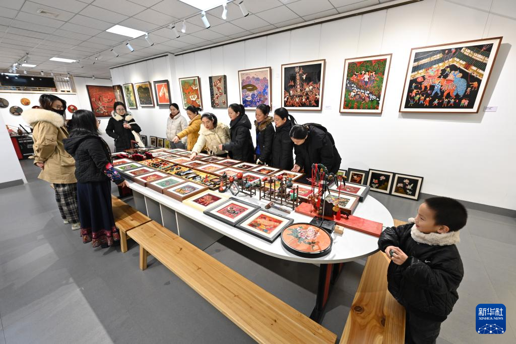 1月10日,农民画爱好者在漳平市农民漆画展厅观摩农民漆画和漆艺展品。