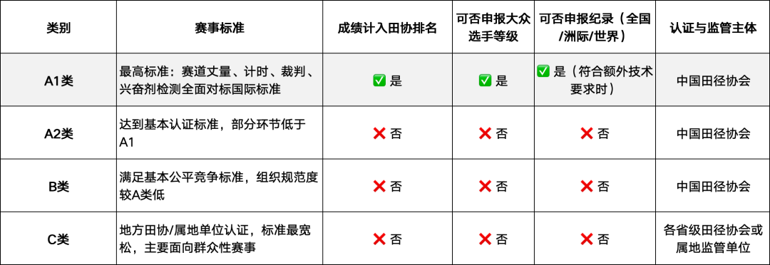 根据《中国田径协会路跑赛事管理办法》,A类赛事为中国田径协会认证赛事的最高等级,细分为A1和A2两个级别。其中,A1类赛事要求的赛道、丈量、距离、计时、裁判、兴奋剂检测等核心竞赛组织工作达到世界田联、全国纪录、成绩认证标准(承认纪录及达标成绩),是中国田径协会认证马拉松赛事的顶级序列。