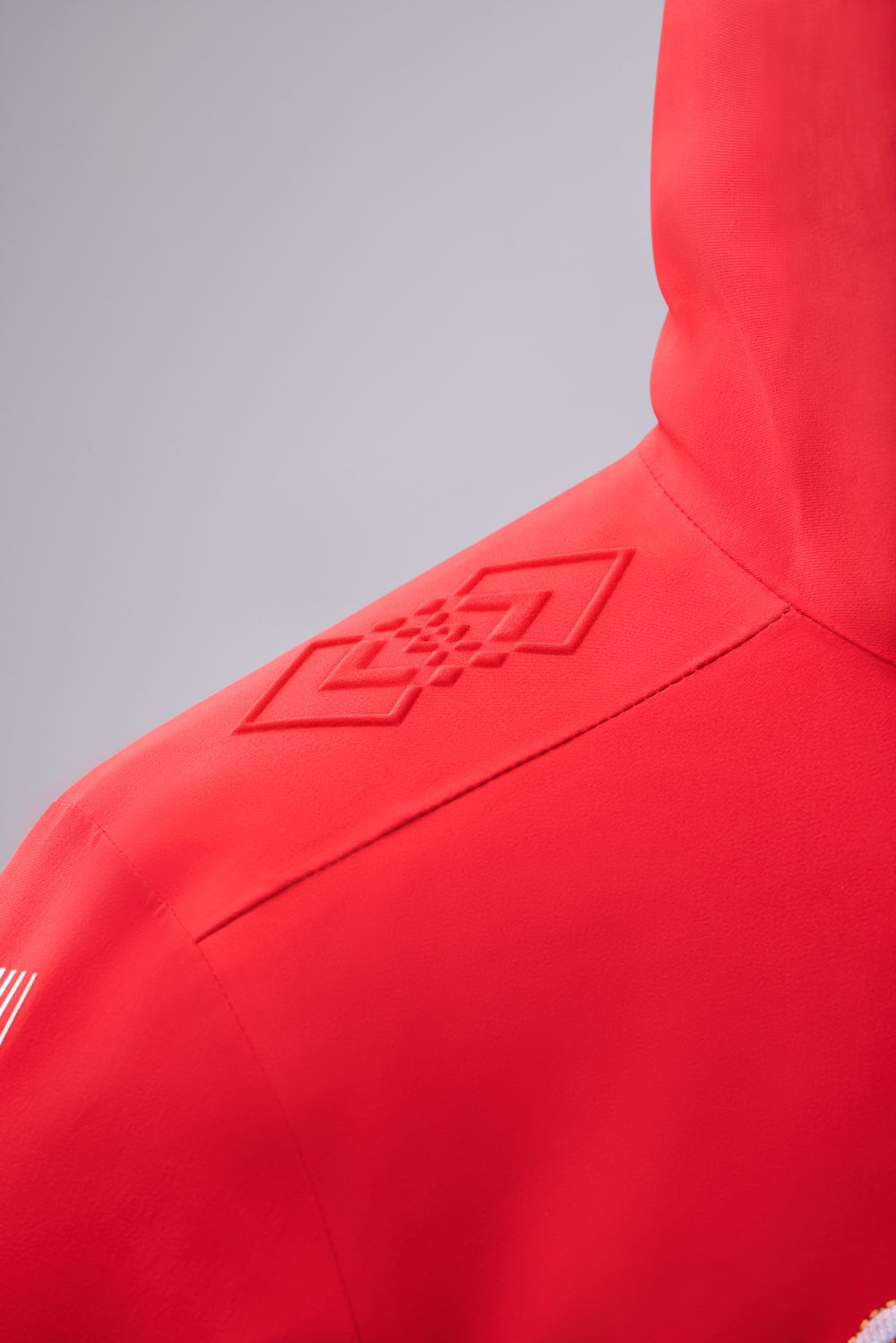 装备由中国奥委会与李宁品牌联合发布。装备以中国红、雪山白为主色调,以上红下白的色彩拼接,凸显中国运动健儿挺拔身姿。领奖服在肩部、袖口等部位采用了传统吉祥寓意纹样——“双胜纹”,纹样由两个菱形交叠穿插而成,寓意胜利、祥瑞。领奖服背后CHINA字母纹饰,在夜晚光照后也清晰可见。